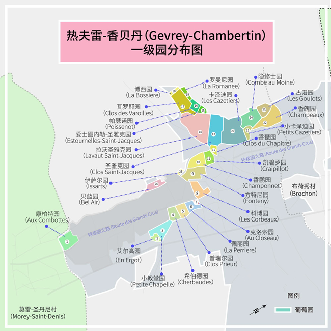 此外,勃艮第還有數(shù)個(gè)大大小小的村莊,不同村莊衍生出了不同的法定產(chǎn)區(qū),各個(gè)村莊獨(dú)特的風(fēng)土也為這些村莊刻上不同標(biāo)簽。比如,提到熱夫雷-香貝丹(Gevrey-Chambertin),就會(huì)讓人想到強(qiáng)勁、飽滿、豐富和堅(jiān)實(shí)的結(jié)構(gòu),以及極強(qiáng)的陳年能力。提到香波-慕西尼(Chambolle-Musigny)就讓人想到優(yōu)雅與精致。