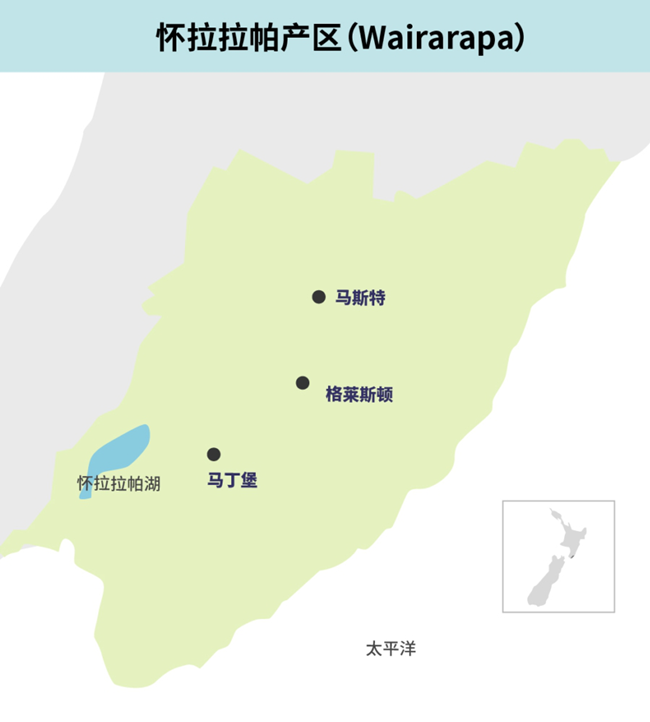 懷拉拉帕位于新西蘭北島的最南端,坐落在該國首都惠靈頓(Wellington)的東部,其名“Wairarapa”在毛利語中意為“閃閃發光的水域”。懷拉拉帕產區的葡萄種植面積很小,僅占新西蘭葡萄種植面積的3%,出產的葡萄酒占該國總產量的1%。