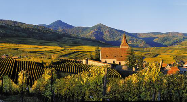 阿爾薩斯在歷史上曾是德國的一部分,位于法德兩國的邊境地帶,是歐洲重要的十字路口,歷史悠久。其葡萄種植區集中在孚日山脈(Vosges mountains)東部山麓地帶一條南北走向的狹長帶狀區域,該區域得益于山脈的遮擋,免受雨水和海風的侵襲,氣候干燥,陽光充足。4月至11月的生長季溫和干燥,通常降雨量較少。9月和10月的氣溫尤其溫和,賦予了葡萄果實漫長且緩慢的成熟期,出產的葡萄酒兼具極佳的清新感和香氣濃度。