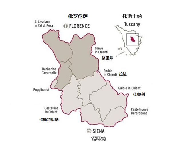 經(jīng)典基安帝產(chǎn)區(qū)地處托斯卡納(Tuscany)大區(qū)中部的佛羅倫薩市(Florence)與錫耶納市(Siena)之間,總占地7萬余公頃,在行政區(qū)域上涉及9個(gè)市鎮(zhèn),涵蓋了拉達(dá)(Radda in Chianti)、佳奧利(Gaiole in Chianti)、卡斯特里納(Castellina in Chianti)和格里弗(Greve in Chianti)這四個(gè)市鎮(zhèn)的全部地域以及其余5個(gè)市鎮(zhèn)的部分地域。