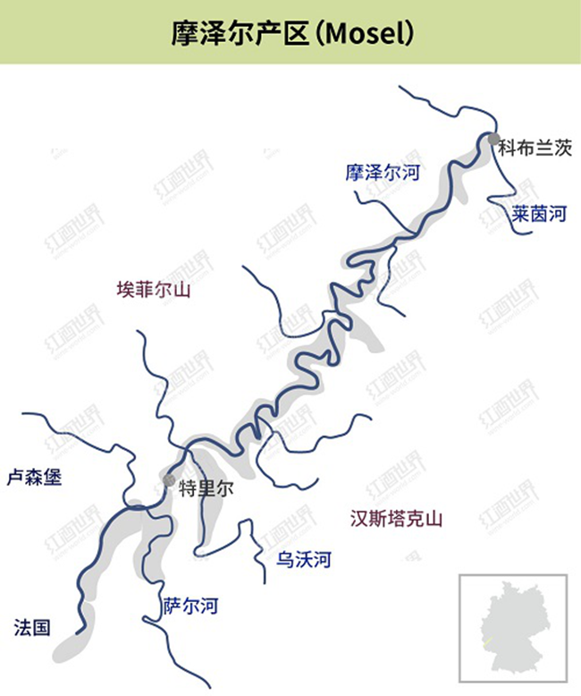 摩澤爾(Mosel)是德國13個法定葡萄酒產(chǎn)區(qū)之一,產(chǎn)區(qū)內(nèi)種植的釀酒葡萄品種主要有雷司令(Riesling)、米勒-圖高(Muller-Thurgau)和艾伯靈(Elbling),其中最有代表性的品種非雷司令莫屬。如今,摩澤爾已經(jīng)成為當(dāng)今世界上最大的雷司令產(chǎn)區(qū)之一,出產(chǎn)的雷司令品質(zhì)卓越,享譽全球。
