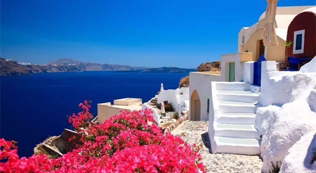 圣托里尼島(Santorini)古名為希臘(Thera),后來為紀念圣·愛蓮(SaintIrene),于1207年被改為圣托里尼。圣托里尼(Santorini)是在希臘大陸東南200公里的愛琴海上由一群火山組成的島環。