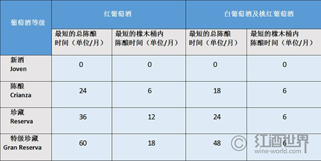 需要注意的是,該表標(biāo)注的只是西班牙規(guī)定的最短陳釀時(shí)間,而有些子產(chǎn)區(qū),如里奧哈(Rioja)和杜埃羅河岸(Ribera del Duero)等,對總陳釀時(shí)間及(或)橡木桶內(nèi)陳釀時(shí)間的要求一般更高。