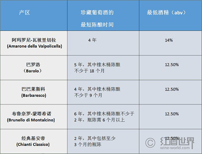 意大利用“Riserva”來表示珍藏,并對該詞的使用作出了嚴(yán)格規(guī)定。但不同于西班牙,意大利的規(guī)定并不統(tǒng)一,而是依各個(gè)產(chǎn)區(qū)的法規(guī)而定:“珍藏”葡萄酒的酒精度和陳釀時(shí)間均需要超過其所在產(chǎn)區(qū)的法定最低標(biāo)準(zhǔn)。因此,在意大利不同的產(chǎn)區(qū),“珍藏”葡萄酒需要滿足的標(biāo)準(zhǔn)大有不同,具體可見下表: