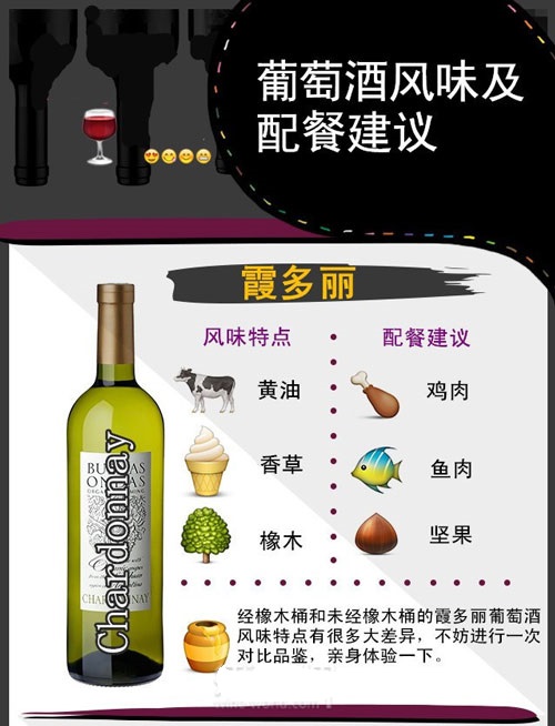 東莞藍(lán)菲城堡葡萄酒代理商用6張圖片列出最主要的6種葡萄酒,并簡要說明相應(yīng)的風(fēng)格特點(diǎn)和配餐建議。比如稱得上“千面女郎”的霞多麗葡萄酒,即可以清新脆爽,也可以豐滿順滑,而決定其風(fēng)格的,除品種本身外,還有釀酒工藝,尤其是橡木桶的使用。【