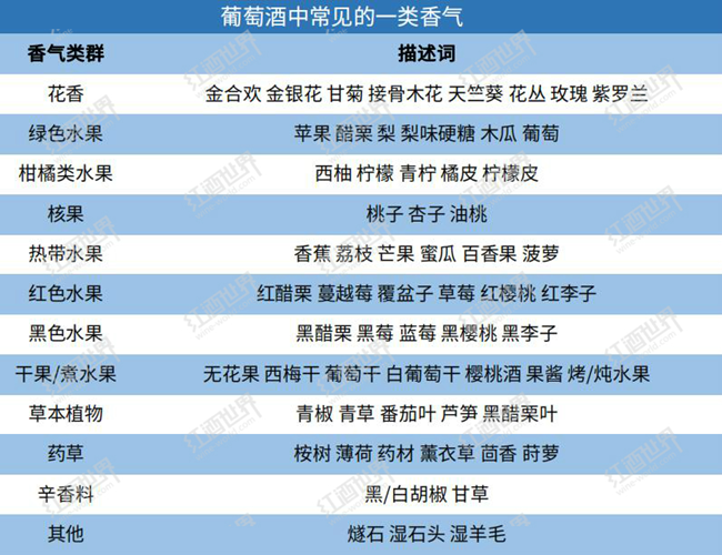 果香通常是葡萄酒一類香氣中最明顯的氣味。紅葡萄酒的果香可分為兩大類群:紅色水果和黑色水果。帶有紅色水果香氣的葡萄品種主要有歌海娜(Grenache)、桑嬌維塞(Sangiovese)和黑皮諾(Pinot Noir)等,這類葡萄酒的顏色通常相對較淺。帶有黑色水果香氣的葡萄酒一般顏色更深,且酒體更飽滿,如赤霞珠(Cabernet Sauvignon)、西拉(Syrah)和慕合懷特(Mouverdre)等。需要注意的是,不少混釀葡萄酒會同時帶有這兩類水果的香氣,如南羅納河谷(Southern Rhone Valley)的GSM混釀葡萄酒(即歌海娜、西拉和慕合懷特混釀)。
