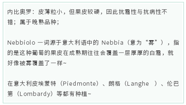 沒(méi)有內(nèi)比奧羅,可能就不會(huì)有意大利酒王之王和酒后了,因?yàn)榘土_洛(Barolo)和巴巴萊斯科(Barbaresco)葡萄酒,都是由100%內(nèi)比奧羅葡萄釀制而成的!