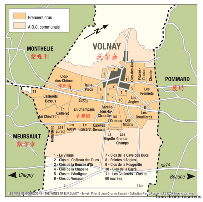 和很多伯恩丘的酒村一樣,沃爾奈沒有特級園(Grand Cru),但有幾塊一級園(Premier Cru)出產的葡萄酒品質出色,有著“準特級園”的稱號。