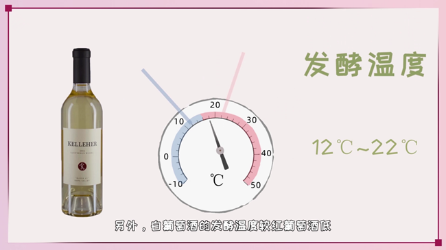 ② 發酵溫度較紅葡萄酒低。白葡萄酒的發酵溫度為12-22℃,此溫度范圍可避免葡萄品種芳香物質的流失;而紅葡萄酒的發酵過程中需要提取葡萄果皮的顏色和單寧,因此溫度較高,為20-32℃。