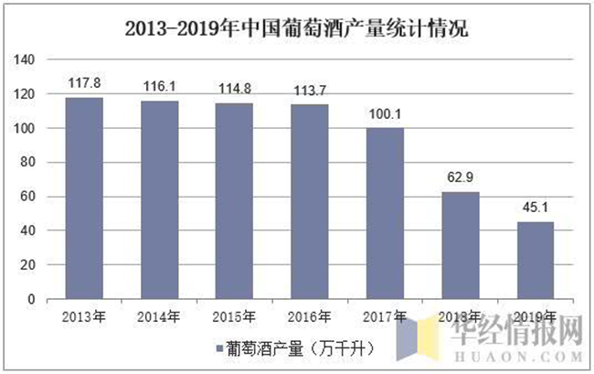 然而,目前中國的葡萄酒產業(yè)發(fā)展并不成熟,隨著我國國民生活質量的提高,對高端葡萄酒需求增加,進口葡萄酒快速蠶食國產葡萄酒市場份額,近年來中國葡萄酒產量持續(xù)下降,2019年中國葡萄酒產量達45.1萬千升,與2018年相比減少了17.8萬千升。