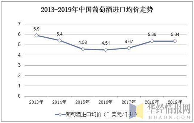 從進口均價來看,近年來我國葡萄酒進口均價基本維持在5千美元/千升,2015年葡萄酒進口均價下降至5千美元/千升以下,2016年以后葡萄酒進口價格又逐漸開始回升,據海關統(tǒng)計數據顯示,2019年國內葡萄酒進口均價為5.34千美元/千升,與2018年基本持平。