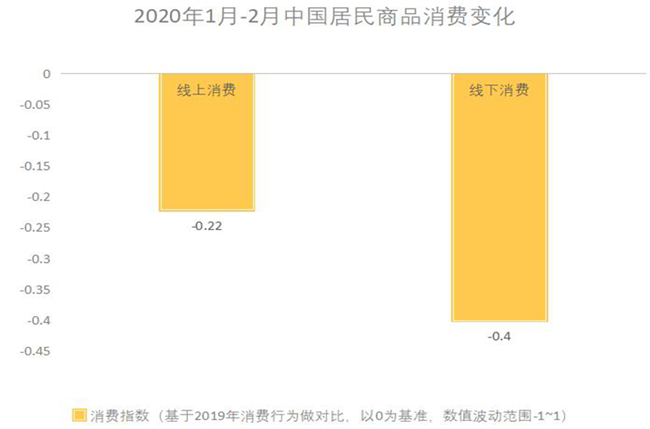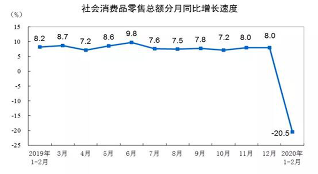 國(guó)內(nèi)自1月份開(kāi)始受到疫情沖擊,生產(chǎn)消費(fèi)幾乎冰凍。1-2月份,社會(huì)消費(fèi)品零售總額52130億元,同比名義下降20.5%(扣除價(jià)格因素實(shí)際下降23.7%,以下除特殊說(shuō)明外均為名義增長(zhǎng)),較去年12月大幅下滑28.5和28.2個(gè)百分點(diǎn),其中僅糧油食品、飲料、藥品等少數(shù)維持正增長(zhǎng)。(數(shù)據(jù)來(lái)源:國(guó)家統(tǒng)計(jì)局)