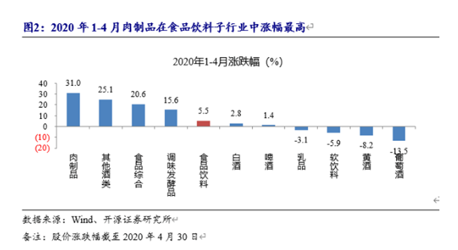 尤其是進入2020年4月份以來,食品飲料板塊上漲9.4%,其中重要原因是:國內疫情控制得當,消費回暖,以白酒為代表的可選消費重新獲得市場青睞,漲幅領跑各大品類,為13.8%,而葡萄酒銷售亦有上漲趨勢,為5.5%。