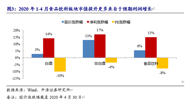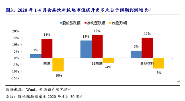 2020年1-4月食品飲料板塊上漲5.5%,在一級子行業(yè)中排名第三。漲幅分解來看,預計2020年凈利增長15%。