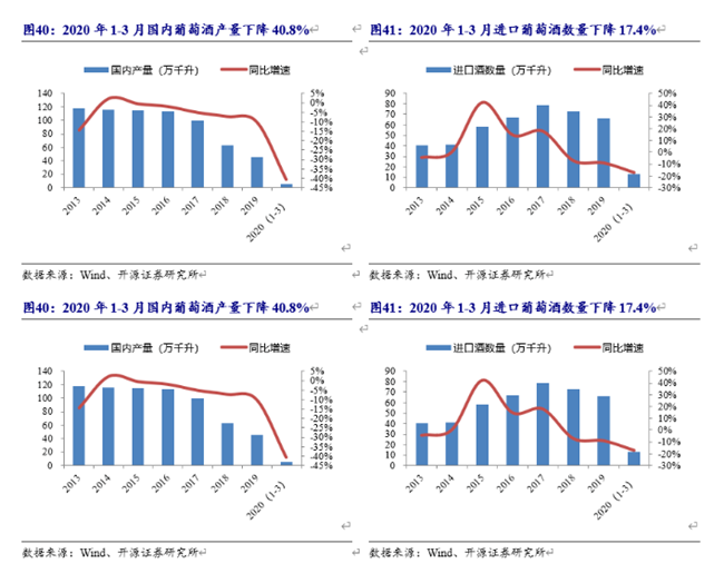 觀察行業(yè)數(shù)據(jù),2020年1-3月國內葡萄酒產(chǎn)量同比降40.8%,降幅較年初擴大;進口酒量同比下滑17.4%,同樣加速下滑。