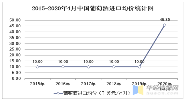 華經產業研究院數據顯示:2020年1-4月中國葡萄酒進口數量為15990萬升,相比上年同期減少了90513.6萬升,降幅為25.3%;進口金額為733117千美元,相比上年同期減少了331919千美元,降幅為31.1%;2020年1-4月中國葡萄酒進口均價為45.85千美元/萬升。