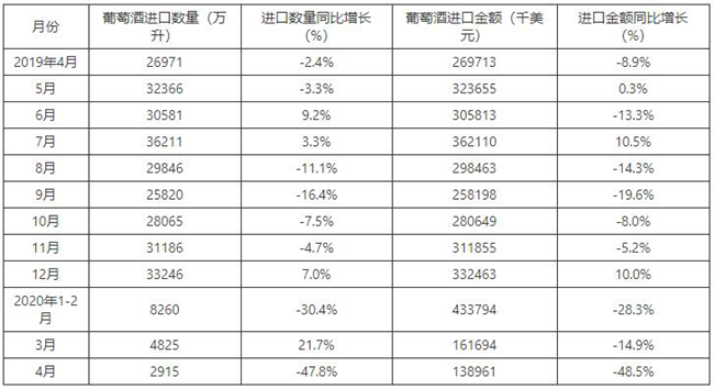 2015-2020年4月中國葡萄酒進口數量及增速