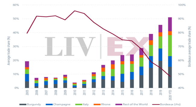 隨著市場繼續擴大,波爾多的交易份額已跌至歷史新低的41%;勃艮第也跌至9.3%。 這進一步證實,買家的興趣已擴展到這兩個高價值酒區之外。