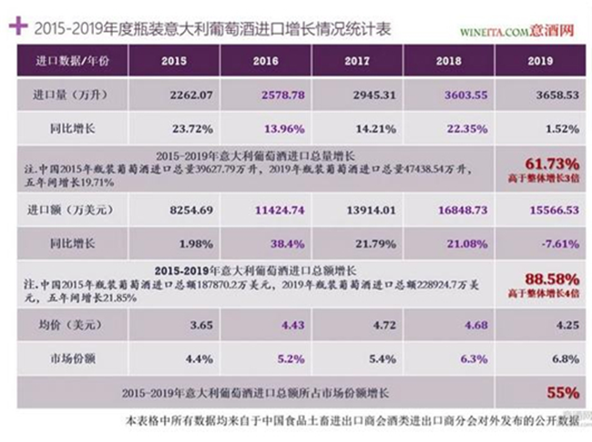 “與美國、加拿大等成熟市場相比,中國為代表新興市場的數(shù)據(jù)變化更能說明意大利葡萄酒逆勢上揚的現(xiàn)象,”意酒網(wǎng)負(fù)責(zé)人宮照馥分析稱,“從近幾年的數(shù)據(jù)來看,2015-2018年,中國市場瓶裝意大利葡萄酒進(jìn)口總額連續(xù)四年增長,只有2019年度相比2018年度下降7.61%。五年間,瓶裝意大利葡萄酒進(jìn)口總額從2015年的8254.9萬美元,增長至2019年的1.5566億美元,五年間增長88.58%,進(jìn)口額增長率是同期中國市場瓶裝葡萄酒進(jìn)口總額增長率的4倍。而從市場份額角度衡量,2015-2019年,中國市場瓶裝意大利葡萄酒進(jìn)口額所占市場份額,實現(xiàn)連續(xù)五年增長,從2015年的4.4%的市場份額,增長至2019年的6.8%的市場份額。我的預(yù)測是,按照現(xiàn)有的五年市場份額增速55%,意大利的市場份額將增加到10.54%。”
