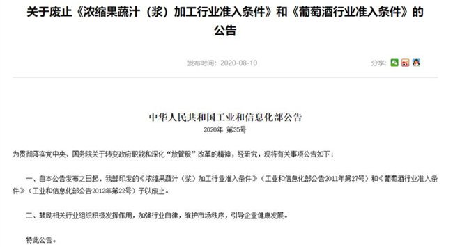 8月10日,中華人民共和國工業(yè)和信息化部發(fā)布公告,稱即日起廢除《濃縮果蔬汁(漿)加工行業(yè)準(zhǔn)入條件》(工業(yè)和信息化部公告2011年第27號)和《葡萄酒行業(yè)準(zhǔn)入條件》(工業(yè)和信息化部公告2012年第22號)。此外,鼓勵相關(guān)行業(yè)組織積極發(fā)揮作用,加強行業(yè)自律,維護市場秩序,引導(dǎo)企業(yè)健康發(fā)展。