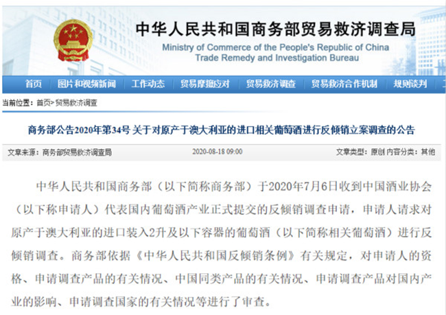 中華人民共和國商務部(以下簡稱商務部)于2020年7月6日收到中國酒業協會(以下稱申請人)代表國內葡萄酒產業正式提交的反傾銷調查申請,申請人請求對原產于澳大利亞的進口裝入2升及以下容器的葡萄酒(以下簡稱相關葡萄酒)進行反傾銷調查。