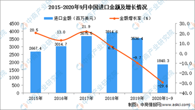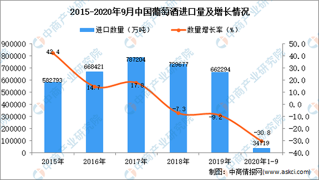 數(shù)2020年1-9月中國(guó)葡萄酒進(jìn)口量及金額增長(zhǎng)情況