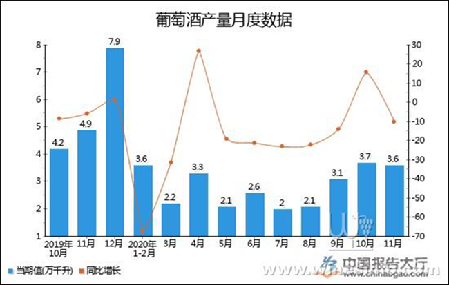 根據(jù)中國報告大廳對2020年1-11月全國葡萄酒產(chǎn)量進行監(jiān)測統(tǒng)計顯示:2020年11月全國葡萄酒產(chǎn)量3.6萬千升,同比下降10%,2020年1-11月全國葡萄酒產(chǎn)量為35.9萬千升,累計增長3.8%。