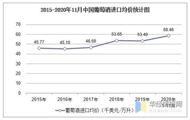 2015-2020年11月中國葡萄酒進口均價統計圖