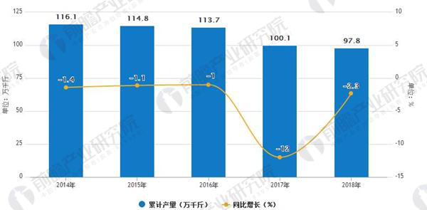 從前瞻產業研究院數據看出,我國葡萄酒的產量情況來看:2014-2017年以來我國葡萄酒呈逐年下滑態勢。2016年全國葡萄酒產量達113.7萬千升,同比下滑1%。2017年大幅下滑,產量為100.1萬千升,同比下滑12%。預計2018年中國葡萄酒產量將下滑至97.8萬千升。