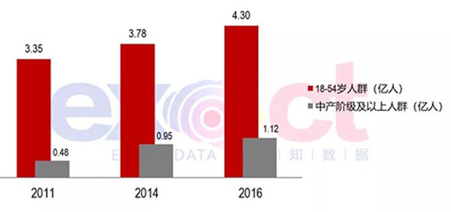 從2011年到2016年間,18-54歲葡萄酒消費人群擴大,由3.35億人增長到4.3億人。其中,中產(chǎn)階級以上人群(葡萄酒主力消費人群)不斷上升,從2011年0.48億人上升到2016年1.12億人。