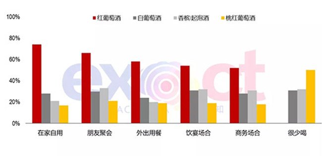 消費者不同場合飲用各類葡萄酒占比(2017)