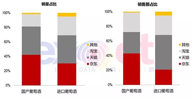 從平臺分布來看,無論國產(chǎn)還是進口葡萄酒均在天貓、京東、淘寶銷售情況最佳,銷售占比超過90%。對比來看,國產(chǎn)葡萄酒在京東的銷售優(yōu)于其他平臺,而進口葡萄酒則以天貓為主要銷售陣地。