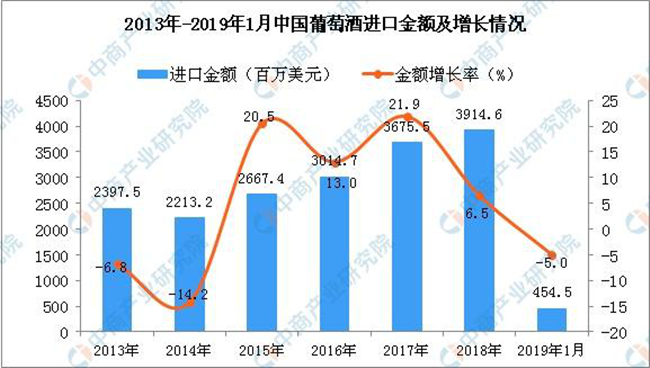 從金額方面來(lái)看,2013年-2014年中國(guó)葡萄酒進(jìn)口金額有小幅度下降,2015年-2018年中國(guó)葡萄酒進(jìn)口金額增長(zhǎng);2019年1月中國(guó)葡萄酒進(jìn)口金額為454.5百萬(wàn)美元,同比下降5%。