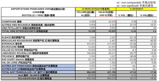 實(shí)際上,去年法國葡萄酒與烈酒的總體出口量有下滑。根據(jù)法國葡萄酒與烈酒出口商協(xié)會(FEVS)公布的數(shù)據(jù)顯示,2018年,法國葡萄酒與烈酒的總出口量下降2.7%,其中靜止葡萄酒出口量下降9.8%,成整體出口量下跌的主要原因。