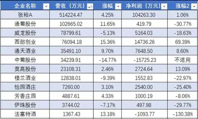2018年被認(rèn)為是中國(guó)葡萄酒行業(yè)的調(diào)整之年,整個(gè)葡萄酒行業(yè)呈現(xiàn)出小幅下滑的局面,據(jù)國(guó)家統(tǒng)計(jì)局?jǐn)?shù)據(jù),2018年全國(guó)規(guī)模以上葡萄酒企業(yè)總產(chǎn)量62.9萬(wàn)千升,比2017年下降7.36%;累計(jì)實(shí)現(xiàn)銷(xiāo)售收入288.51億元,同比下降9.51%;累計(jì)實(shí)現(xiàn)利潤(rùn)總額30.63億元,同比下降9.46%。這12家上市企業(yè)發(fā)布的年報(bào)數(shù)據(jù),與去年整年的行業(yè)氛圍相符。大概也正是因?yàn)槿ツ晷袠I(yè)“看跌”的聲音不絕于耳,提前打了“預(yù)防針”,當(dāng)全年數(shù)據(jù)公布和12家公司年報(bào)披露時(shí),行業(yè)沒(méi)有表現(xiàn)出很大的落差。