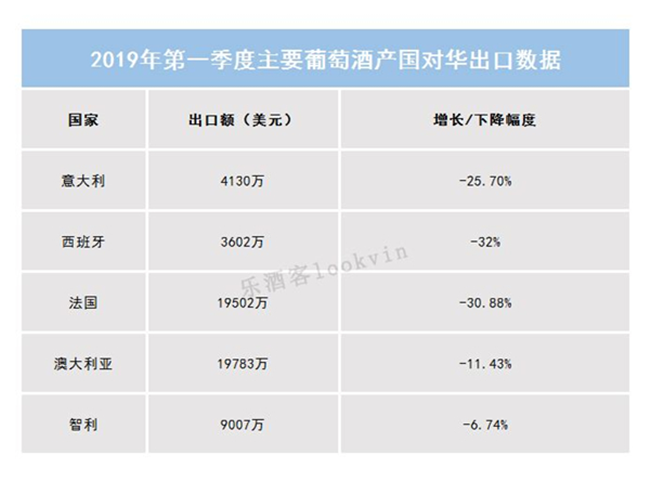 葡萄酒新聞網站Winenews近日公布了2019年第一季度(1月至3月)中國進口葡萄酒的數據報告,報告顯示,中國葡萄酒進口持續下滑,主流葡萄酒產國對華市場的出口額出現了不同程度的下降。