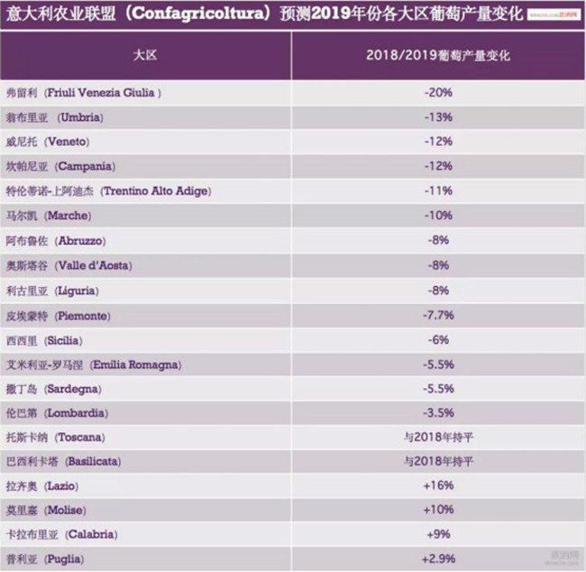 意大利農業聯盟(Confagricoltura)研究中心也主要針對2019年意大利各大區的葡萄產量進行了預測。在分析了來自個大區主要葡萄酒產區的代表性酒莊的葡萄樣本之后,意大利農業聯盟(Confagricoltura)研究中心認為,2019年,意大利大部分地區的葡萄產量都將出現不同程度的下降。其中弗留利(Friuli Venezia Giulia )大區的葡萄產量降幅最大,預計將比2018年減少20%。翁布里亞、威尼托、坎帕尼亞、特倫蒂諾-上阿迪杰、皮埃蒙特、艾米莉亞-羅馬涅等大區在2019年的葡萄產量都將出現不同程度的降幅。