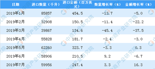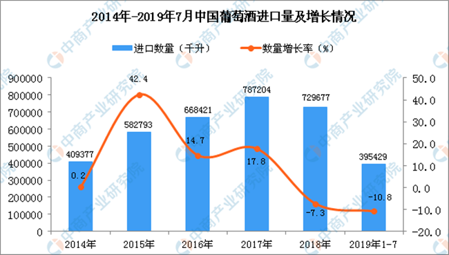 據中商產業研究院數據庫顯示,2019年1-2季度中國葡萄酒進口量有所增長,2019年1-7月中國葡萄酒進口量為395429千升,同比下降10.8%。