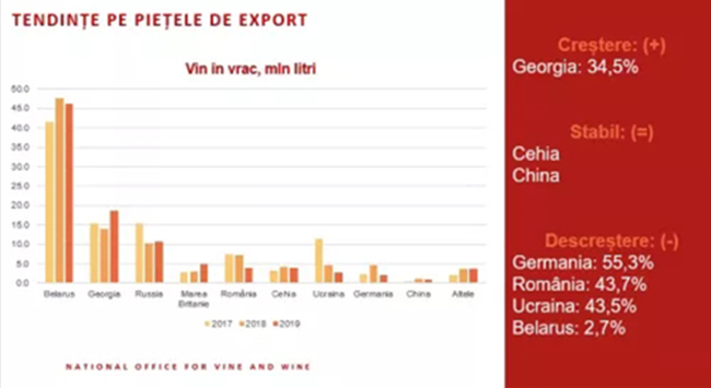 瓶裝葡萄酒的出口總值為13.76億列伊,與2018年指標持平,而散裝葡萄酒的出口總值下滑至 9.76億列伊(-3.6%)。葡萄酒出口總值為23.52億列伊(-1.9%)。