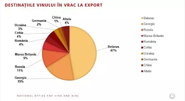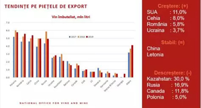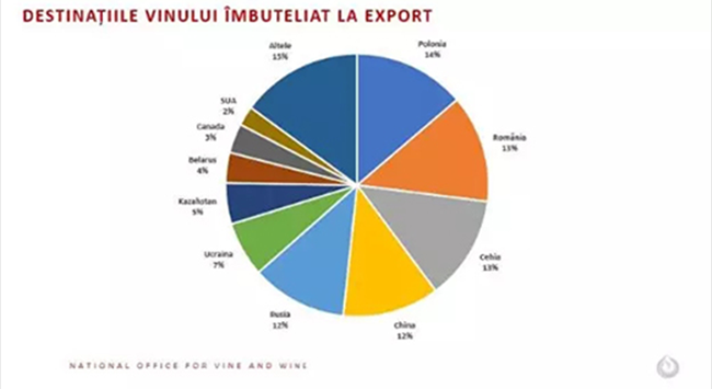 波蘭、羅馬尼亞、捷克、中國和俄羅斯仍然是摩爾多瓦瓶裝葡萄酒的主要市場。出口到美國(+11%)、捷克共和國(+8%)、羅馬尼亞(+5.8%)、烏克蘭(+3.7%) 的瓶裝葡萄酒數量有所增加,出口到中國和拉脫維亞的數量保持穩定,但是出口至哈薩克斯坦(-30%)、俄羅斯(-16.9%)、加拿大(-11.8%)、波蘭(-5%)的瓶裝葡萄酒數量有所下降。