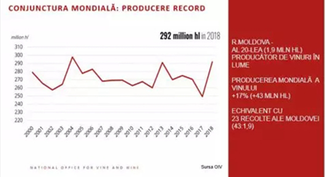 不僅是摩爾多瓦共和國正在經歷葡萄酒生產過剩。2018年全球葡萄產量也達到了創紀錄的水平(+17%,即430萬千升),增長量相當于摩爾多瓦共和國23年的葡萄收獲量。
