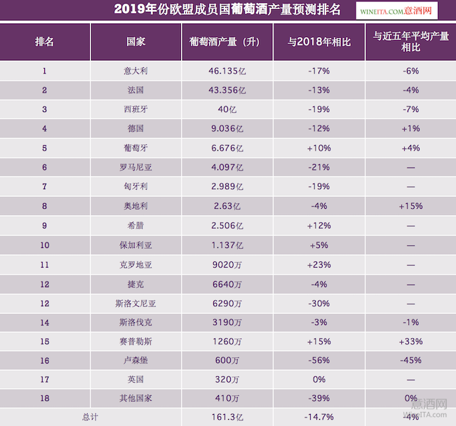 2019年預(yù)估葡萄酒產(chǎn)量排名前十的國家還有羅馬尼亞(4.097億升)、匈牙利(2.989億升)、奧地利(2.63億升)、希臘(2.506億升)和保加利亞(1.137億升)。