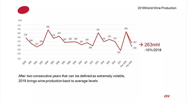 據國際葡萄與葡萄酒組織(OIV)最新數據顯示,2019年全球葡萄酒產量為263億升(mhl),同比2018年下降了10.54%。包括法國、意大利、西班牙在內的葡萄酒主產國產量均有不同程度下降。OIV的數據來自28個國家,占全球葡萄酒產量的85%。