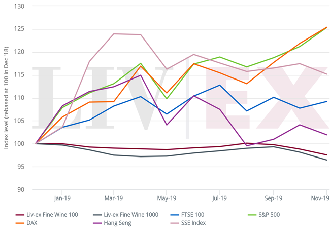 為了更好地反映優(yōu)質(zhì)葡萄酒的表現(xiàn)情況,下圖將Liv-ex 100和Liv-ex 1000與全球股票進行比較。盡管優(yōu)質(zhì)葡萄酒指數(shù)相對穩(wěn)定,但由于利率下調(diào)提高了投資者承受風險的意愿,使其表現(xiàn)仍遠遠落后于全球股市。恒生指數(shù)一向表現(xiàn)平平的香港,成為了優(yōu)質(zhì)葡萄酒需求的主要來源。 事實上,自春季以來,該指數(shù)和上證綜合指數(shù)一直下跌。