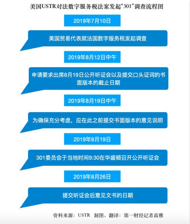 USTR在對法“301調(diào)查”后,認定法國數(shù)字服務(wù)稅歧視美國企業(yè),擬向63項總價值為24億美元的法國輸美產(chǎn)品加征最高100%的關(guān)稅,USTR此前還特地在聲明中指出,在聽證會后,希望“迅速進行征稅等活動”。