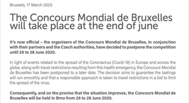 針對目前流行的Covid-19新型冠狀病毒對于全球的影響,在經過組委會與主辦地的積極協商后,現決定“2020(捷克·布爾諾)比利時布魯塞爾國際葡萄酒大獎賽”將延期至2020年6月26日至28日舉辦。同時,為了緩解報名企業的物流運輸壓力,全球樣品征集截止時間也將適度順延。