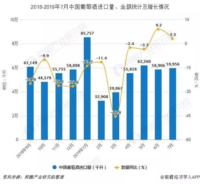 據中國海關總署數(shù)據顯示,2019年1-2季度中國葡萄酒進口量有所增長,2019年7月中國葡萄酒進口量為59956千升,同比增長3.3%。累計方面,2019年1-7月中國葡萄酒進口量達到395429千升,同比下降10.8%。